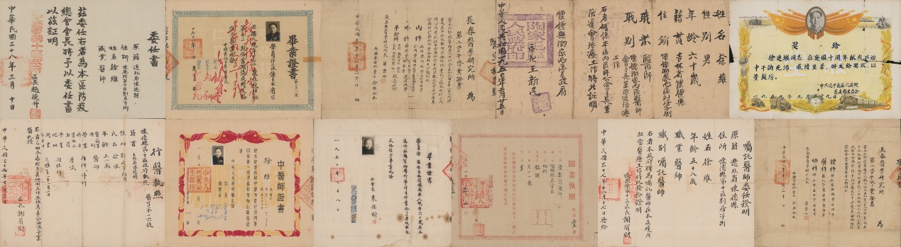 近日,博物馆获得徐光伟女士捐赠文物。包括中国医科大学药学院毕业证书、长春医学院研究所第一学年修业证书、长春医学院研究所第二学年修业证书、长春医学院研究所毕业证书、中医师证书、民国时期行医执照、徐维1950年开业执照、徐维嘱托医师委任证明、徐维防疫总会会长委任书、医师公会会长兼防疫会治疗工作证明书,共计11件。