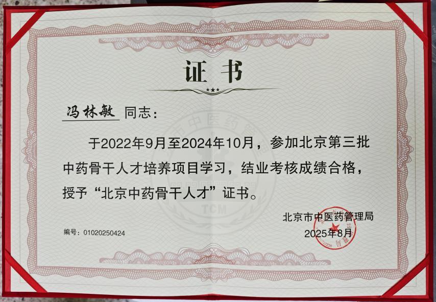 喜报:我馆冯林敏老师被授予“北京中药骨干人才”称号