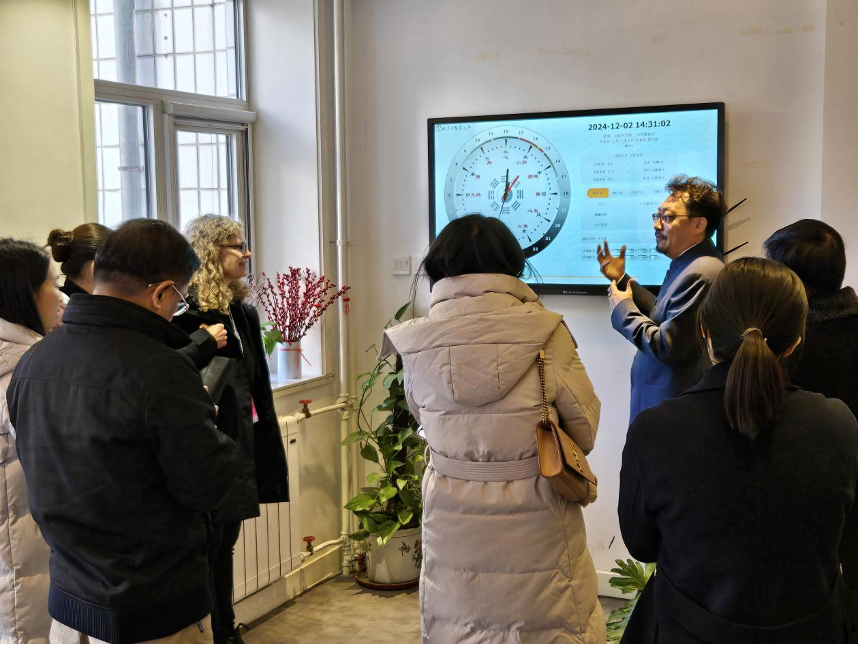 步入中医药体验馆,北京中医药大学国际教育学院(国家中医国际传播中心)王珊珊副主任首先对嘉宾们的到来表示热烈欢迎; 王乐鹏副教授向嘉宾们介绍时间医学钟,以“天人相应”为核心,揭示时间与人体健康之间的深层联系,带领嘉宾们走入中医药的世界。