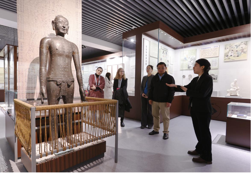 体验馆参观后,嘉宾们移步到中医药博物馆的中国医学史展厅,在学生讲解员的带领下领略了中医药发展的源远流长。他们专注地听着讲解,对龟板上的甲骨文、长沙马王堆的导引图、芳香药物、孙思邈的坐虎针龙和养生方法、针灸铜人以及清代的圆药柜、老药铺等都表现出极大兴趣。