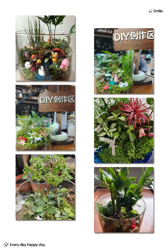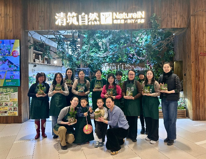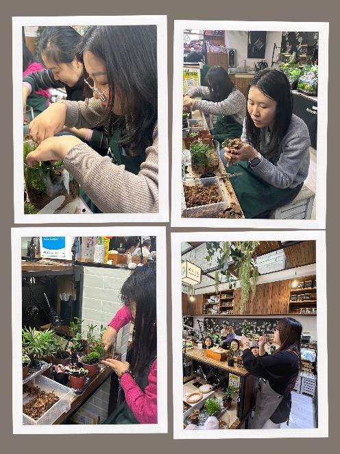 活动伊始,工作坊讲师深入浅出地讲解了微景观背后“枯木逢春”“返璞归真”的文化内涵,详细介绍了苔藓、小型绿植等植物特性及工具使用方法,通过完整示范拆解分层造景、色彩搭配等制作要点。在实操环节中,工作坊讲师全程巡场指导,及时解答创作疑问,帮助大家优化作品形态,老师们兴致盎然地动手实践,从铺陈基底、挑选植物、摆放栽种,到选料点缀,每一步都饱含巧思并在创作间隙交流心得,分享设计灵感,现场氛围轻松融洽。活动尾声,大家手捧着自己亲手打造的微景观作品合影留念。
