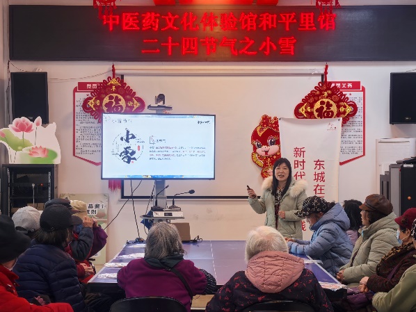 讲座中,潘老师详细解读了小雪作为冬季第二个节气的气候特征,以及"虹藏不见""天气上腾,地气下降""闭塞而成冬"的三候变化,让居民们明白节气得名的由来并非降雪量大小,而是"地寒未甚而雪未大"的气候渐进特征。在民俗分享环节,潘老师介绍了南北地域的特色习俗:北方"小雪腌菜,大雪腌肉"的食物储藏智慧,南方"糍粑禄禄烧"的祭祀传统,以及浙江长兴酿造"小雪酒"等时令习俗,引发居民们的热烈讨论。