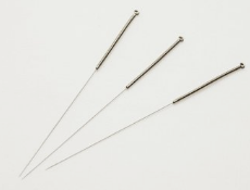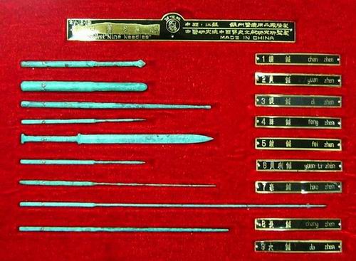 我国的针灸疗法历史悠久,1968年,还曾经出土过金银质地的医疗用针。河北满城县中山靖王刘胜的墓中,出土了9枚医疗用的针具,其中有金针4枚,银针5枚。针身长度分别为6.5~6.9厘米不等,上端均为方柱形的柄,宽0.2厘米,比针身略粗,针尖有的尖锐,有的稍钝,有的呈圆卵状,有的为三棱形,说明不同的针型有不同的用法和用途,这也属于医学发展早期使用的针刺用针。