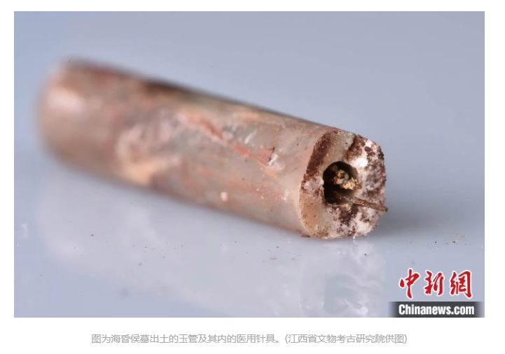 2025年7月5日,海昏侯墓考古发掘领队杨军在接受中新社记者采访时表示:“海昏侯墓的主棺中出土了一批精美的贴金漆盒,其中一个漆盒中有一段玉管,里面有纺织物包裹着的一套作为中医针灸用的钢针。”杨军提到,漆盒中的钢针是墓主人刘贺的头部出土的,应该是他贴身并经常使用的物品。