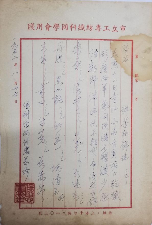 下笺为佟忠义于1952年8月27日以“市立工专纺织科同学会用笺”所拟,患者陆左,表热十二日有汗不多,舌黄垢口干腻,头痛而晕,气闷便溏不畅,溲少,脉结数,邪滞所伏不轻也,急以泄热导滞法,药用桑叶三钱、茯苓三钱、只(枳)壳(炒)三钱,黄连乔(翘)三钱,丹皮三钱、黑山栀三钱、竹茹三钱、块滑石四钱、青蒿三钱、赤芍三钱、牛蒡三钱、辰赤苓(三钱)、鲜芦根、鲜佛(手)三钱,落款伤科医师佟忠义诊,处方布局工整,每列四味药,排列整齐,书写流畅一气呵成。