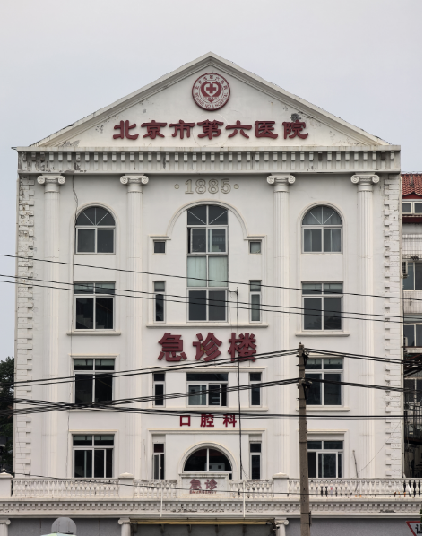 北京市第六医院位于北京市东城区交道口北二条36号。走进医院,迎面首先看到的就是急诊大楼,这幢现代建筑与大部分医院严肃庄重的建筑风格不太一样,楼的主体为白色,屋顶呈坡形设计,屋顶正中悬挂红色医院院徽,下方有“北京市第六医院”及“1885”字样。整楼装潢对称分布,房顶檐口增加了花纹,楼身有四根立柱装饰。整幢急诊大楼呈现出西洋式建筑风格。难道这栋楼是西方人建造的?为什么会有“1885”的字样呢?