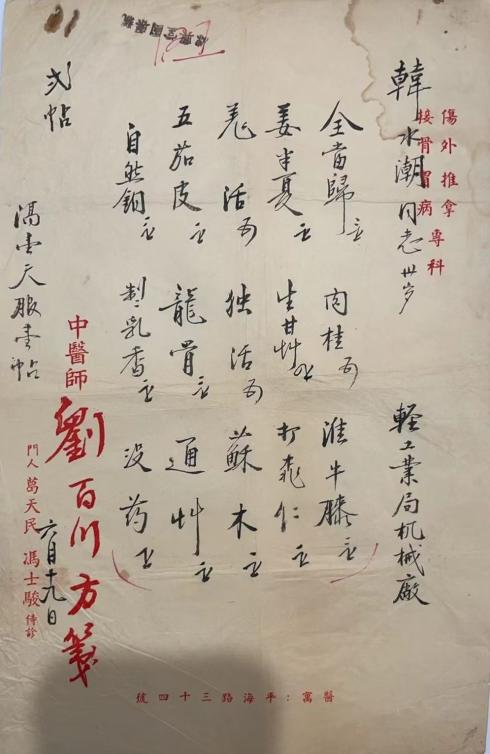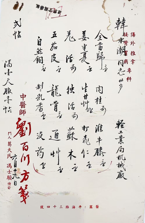 下图为刘百川方笺一则,患者韩水潮同志,三十岁,轻工业局机械厂,六月十九日诊,药用全当归三钱、肉桂一钱半、淮牛膝三钱、姜半夏二钱、生甘草四钱、打桃仁二钱、羌活一钱半、独活一钱半、苏木二钱、五茄皮二钱、龙骨三钱、通草二钱、自然铜三钱、制乳香二钱、没药一钱,二帖,隔一天服一帖。推测用于外科跌打损伤,以苏木、自然铜、乳香、没药散瘀止痛、接骨疗伤、消肿生肌,淮牛膝、五加皮、龙骨补肝肾强筋骨,当归、桃仁补血活血祛瘀,肉桂、通草温阳利水行气通络,羌活、独活祛风湿止痛,全方功效以温阳活血化瘀、舒筋活络为主,适用于外伤后的瘀血肿胀、疼痛等症状。