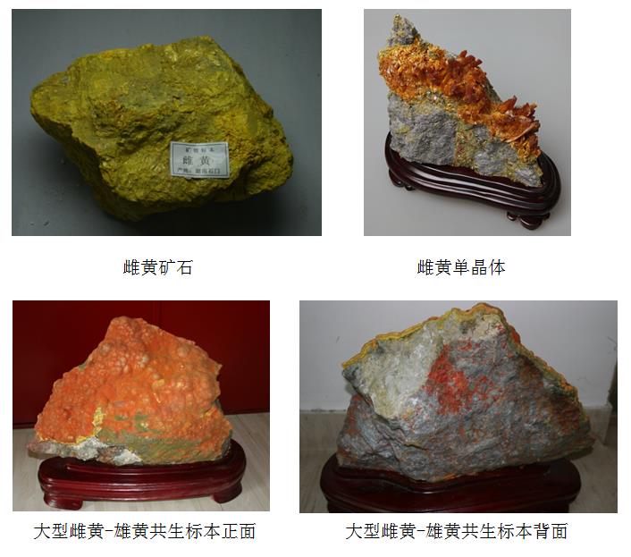 博物馆展出的这件巨大的雌黄标本,其实是雌黄与雄黄共生的葡萄状天然矿物。正面橘黄色部分为雌黄与雄黄的混合物(硫磺与砷的硫化物的混合物);柠檬黄色部分为雌黄、拟雄黄、硫磺的混合物;而左下方的少许白色粉末,即雄黄氧化形成的三氧化二砷(As2O3),即砒霜;背面的橘红色矿物,则是雄黄。这样的矿物标本,实属罕见。实际上,雌黄、雄黄在一定温度下都可以氧化成砒霜,雄黄与硫在高温下煅烧可以还原成雌黄,三者之间的确有密不可分的联系。