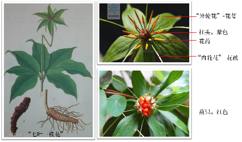 其最大的特征就是在一圈轮生的叶子中冒出一朵花,叶片5~9,故称“七叶一枝花”,片数有个体差异,“七叶”只是名称;花分两个部分,外轮花是花萼,极像叶子,故又称“重台、三层草,灯台七”;内轮花即为花被,呈黄绿色线形,又称“金线重楼”;其根状茎横走,类似甘遂,故又称“草甘遂”;其功效为清热解毒,“蛇虫之毒,得此治之即休”,故又名“蚤休” 。