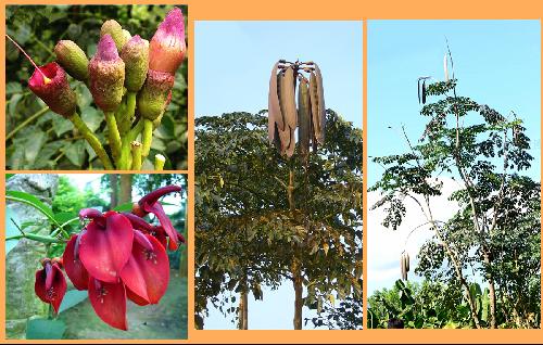 木蝴蝶为大乔木,高可达12米。树皮厚,有皮孔。叶对生,大型奇数羽状复叶,长可达1.6米;小叶多数,三角状卵形小叶片长可达14厘米,花萼紫色钟状,花冠橙红色,肉质,钟形,直径可达8厘米;蒴果木质,扁平,阔线形,下垂,长可达1.2米,宽可达8厘米,边缘稍内弯,似剑似船,中间有一条微突出的背缝,成熟时棕黄色,沿腹缝线裂开。种子多数,种子连翅长约7厘米,宽约4厘米,似白色蝴蝶,会从腹缝线处飞出。