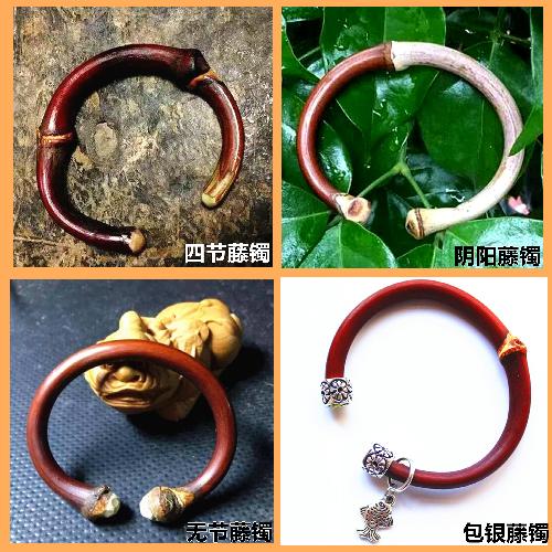 清末至民国时期,还有一种漆藤的手镯,据说可以避邪治病,以木柳或海柳为材质在其上钻孔灌铅,再上黑漆。这种清代漆藤手镯留存现在的极少。此期间还有一种枫藤手镯,其实就是用单股或是多股的爬山虎的枝蔓扭成镯子,多股的即为麻花镯,这种镯子通常在接口处用金银缠裹,此类手镯价廉且亦有消肿祛毒作用,故在普通百姓间较为流行。民国时期著名作家张爱玲,就是一个对藤镯情有独钟的人,在她的文学作品中就曾多次提及她所佩戴的藤镯。