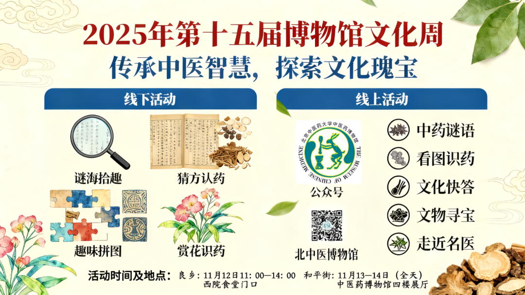 为传承中医药千年智慧,探索中华优秀传统文化的瑰宝,北中医博物馆隆重举办第十五届“博物馆文化周”活动。本届文化周以 “传承中医智慧,探索文化瑰宝” 为主题,精心策划了线上与线下系列趣味活动,旨在让大家在互动体验中感受中医药文化的独特魅力。